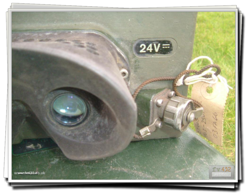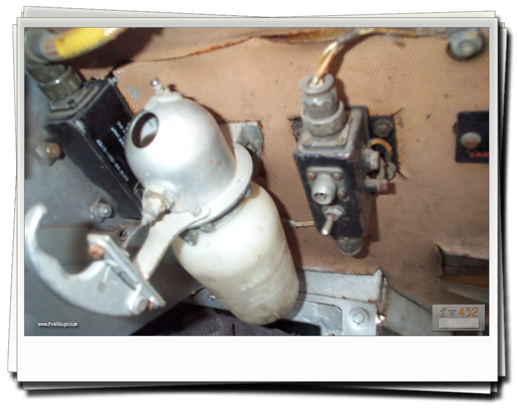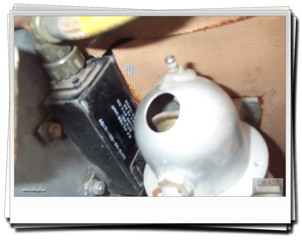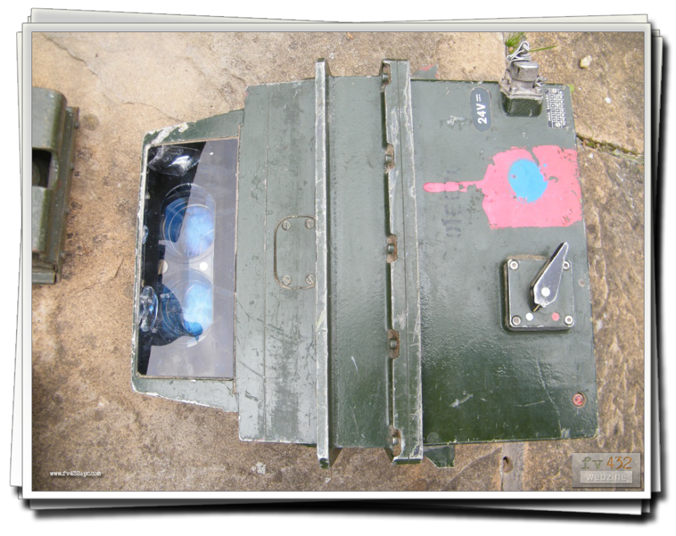 The nightscope is fitted to the drivers hatch in place of the standard drivers periscope, allowing driving at night. A lead is connected to the RF filter up in the left hand corner. Infra-red lenses are fitted to the inner pair of headlights. The headlights are switched on, aswell as the blackout switch. This will turn off all the other lights and as the lenses are fitted, the vehicle appears to the naked eye, not to have any lights on at all! To power the actual scope, as it is powered through the RF filter which in turn gets its feed from the wiper switch, I disconnect the cable that goes to the wipers (at the wiper switch), and basically switch on the wipers. The nightscope has either a lever or knob switch (as there are a couple of types) which darkens or brightens the image seen in the scope.