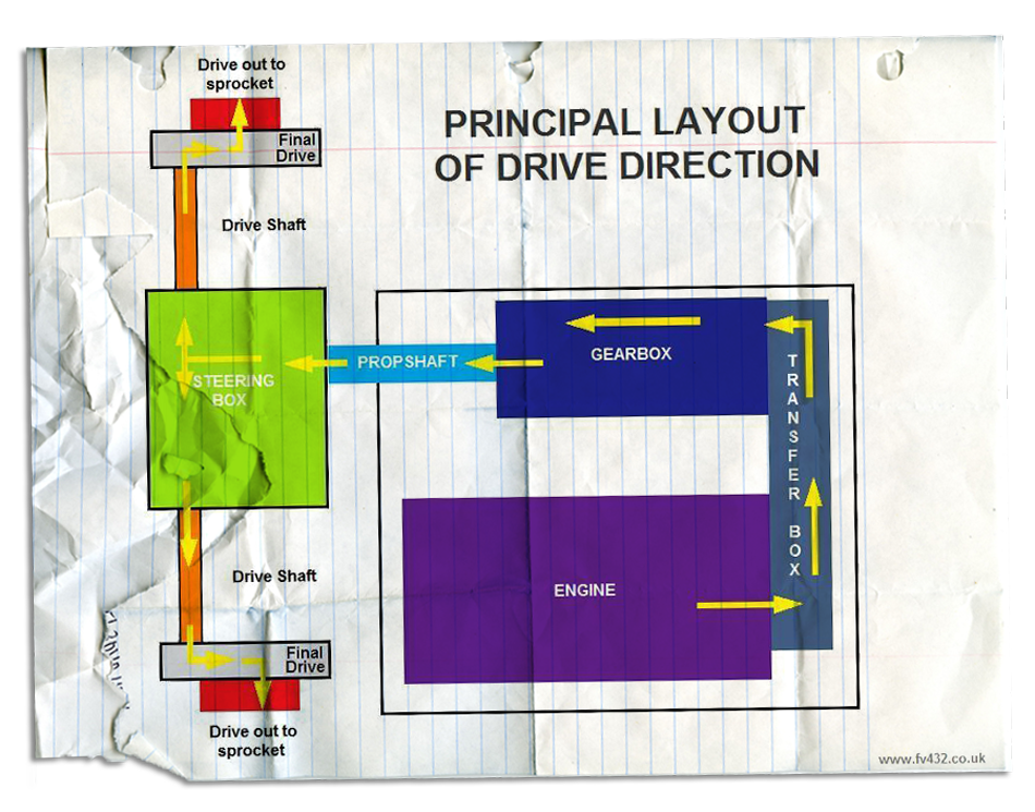 Next we have the basic layout of the major powertrain components and how the drive finds its way from the engine to the track drive sprockets.
